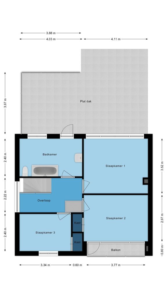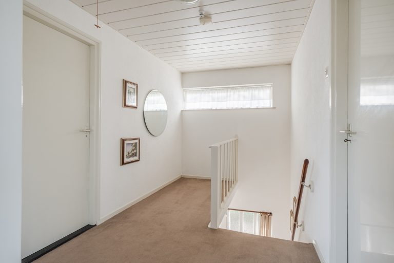 De royale overloop biedt de mogelijkheid om eenvoudig een vaste trap naar de zolder te realiseren. Op deze verdieping bevinden zich drie ruime slaapkamers, alle afgewerkt met tapijt. De master bedroom aan de achterzijde is voorzien van een airco van Mitsubishi. De twee slaapkamers aan de voorzijde beschikken over praktische inbouwkasten.