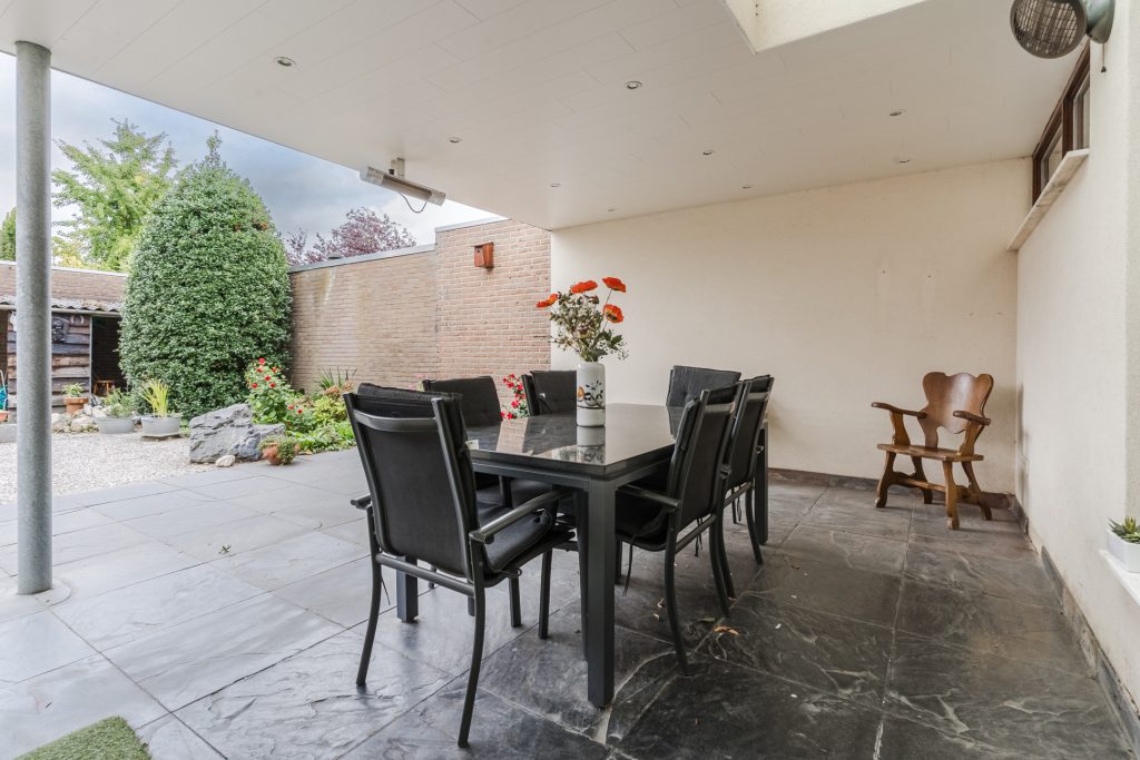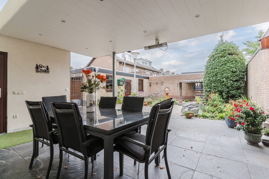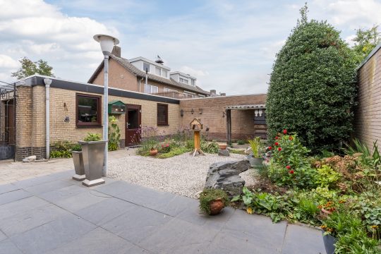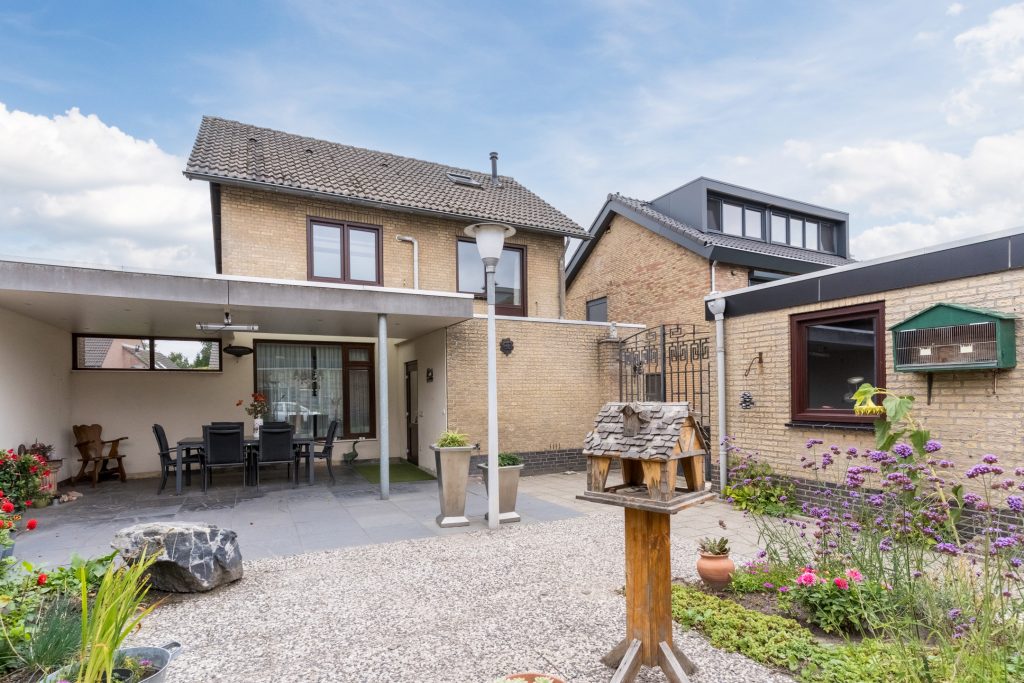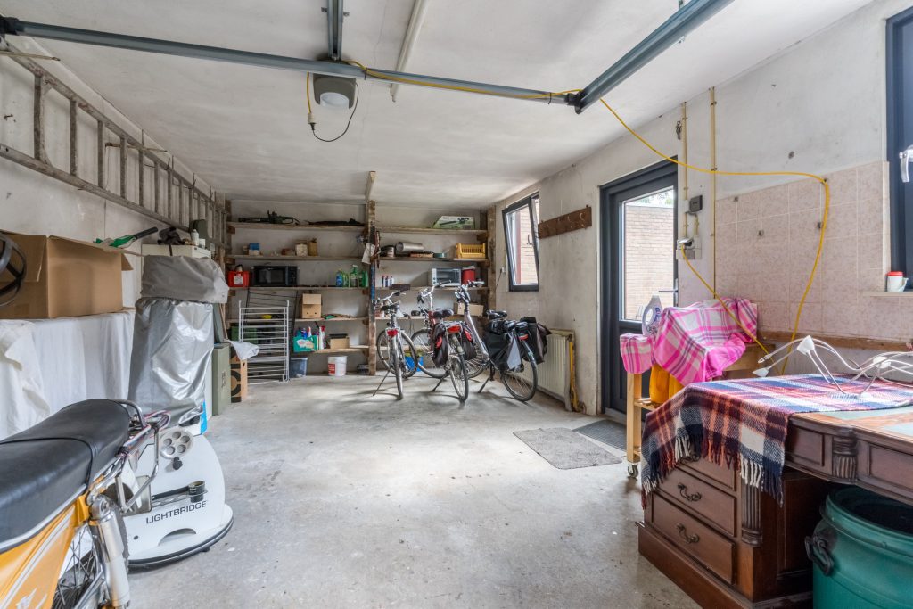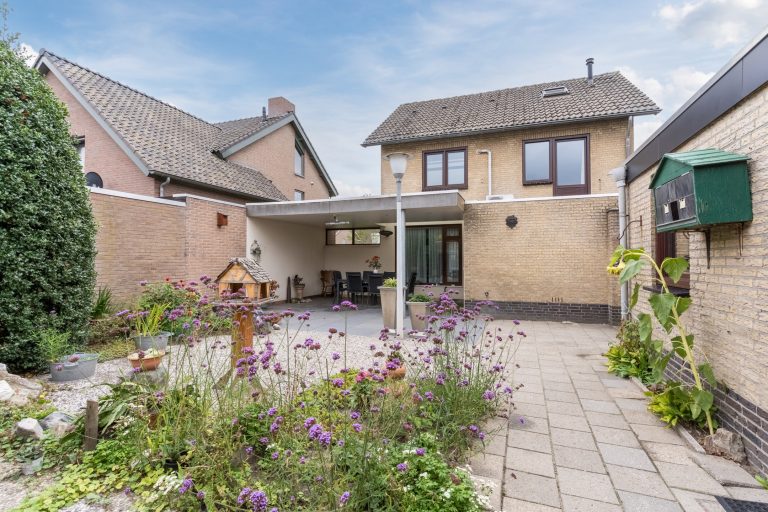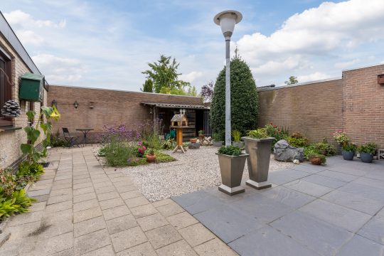 De achtertuin is voorzien van een fijne terrasoverkapping, bestrating, diverse beplanting, hondenhok, achterom met een dubbele poort en een brede, in spouwmuren gemetselde garage met een elektrisch bedienbare segmentdeur.