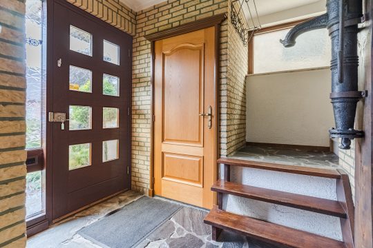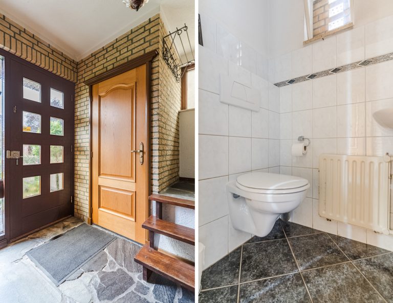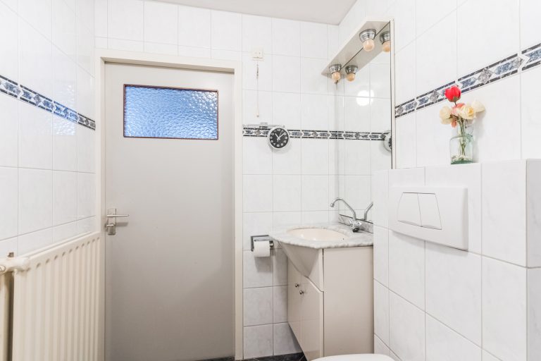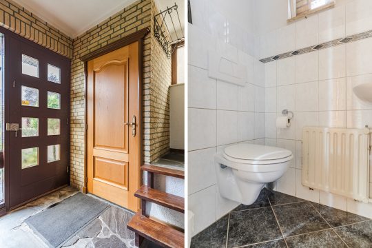 Entreehal met een leisteen tegelvloer, gedeeltelijk betegelde toiletruimte met wandcloset en fonteintje, meterkast (6 groepen en 1 aardlekschakelaar) en trapopgang naar de 1e verdieping.