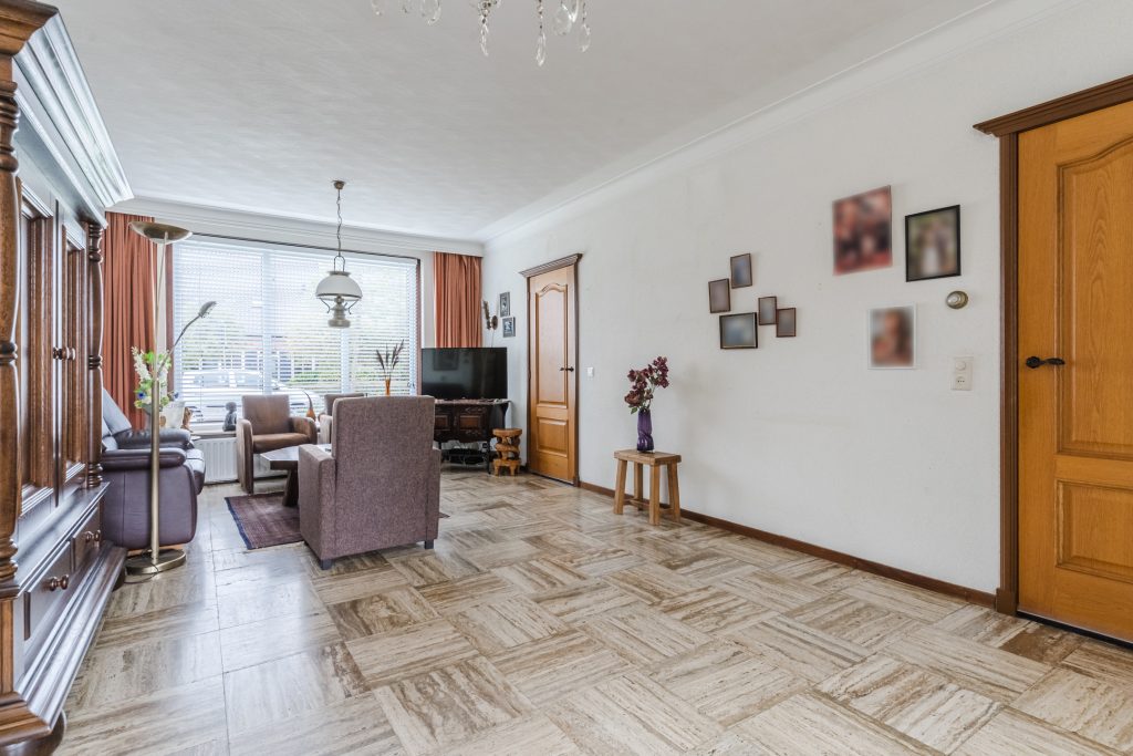Doorzon woonkamer met een travertin tegelvloer, spachtelputzwanden en een stucwerkplafond met sierlijst.