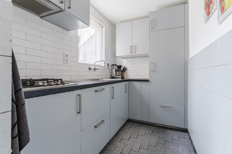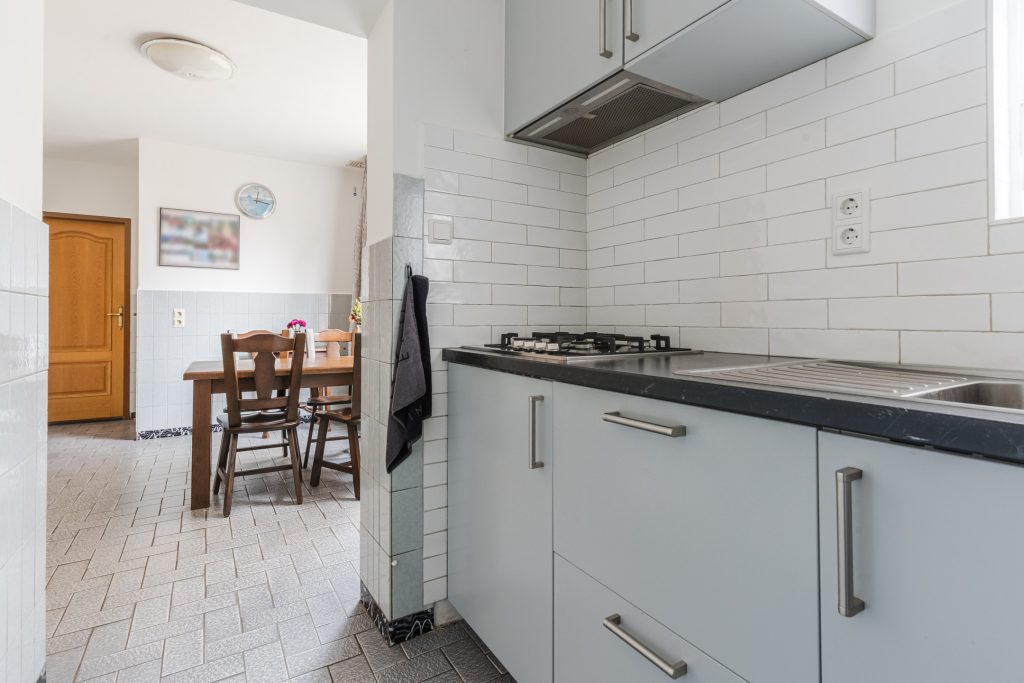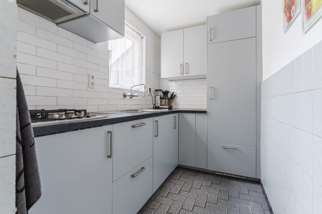 Ruime leefkeuken met een tegelvloer, praktische verdiepte kelderkast en een nette keukeninrichting (2022) in hoekopstelling voorzien van een gaskookplaat, afzuigkap en koelkast.