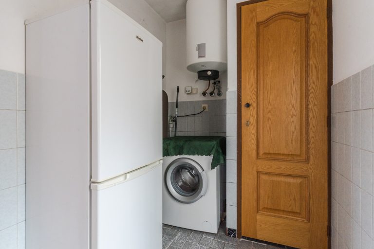 Gedeeltelijk betegelde bijkeuken met deur naar de achtertuin en terrasoverkapping, wasmachine-aansluiting, inbouwkast en opstelling van de warmwaterboiler.