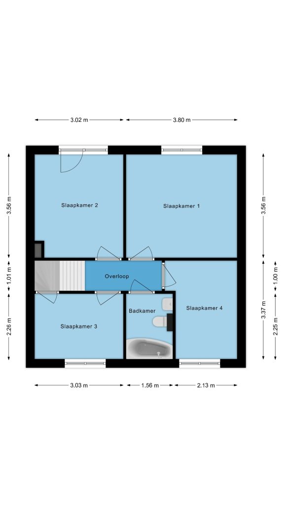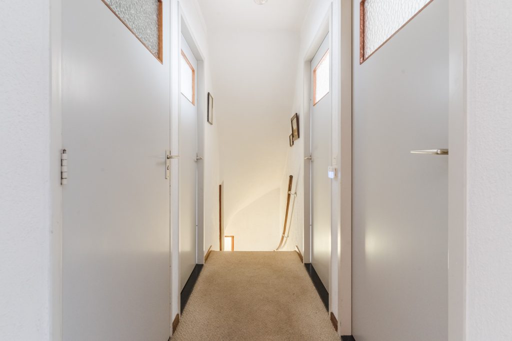 Overloop met vloerbedekking en toegang tot 4 slaapkamers en de badkamer.
