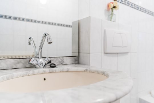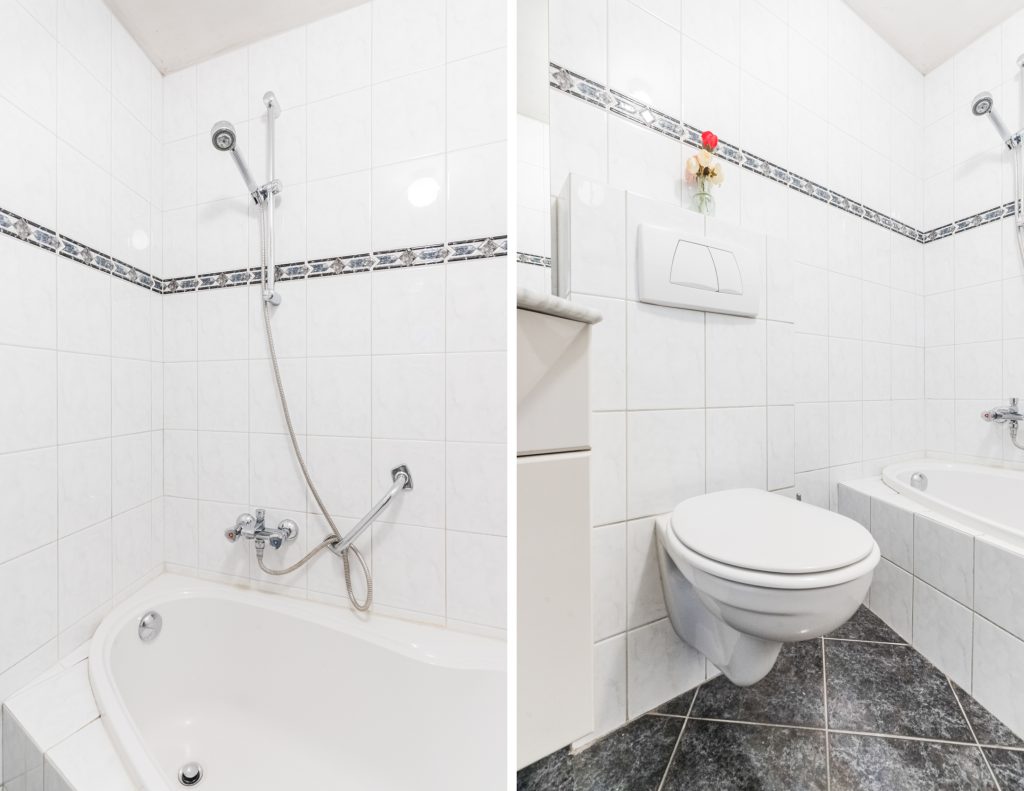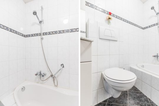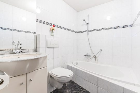 Volledig betegeld badkamer voorzien van een ligbad-/douchecombinatie, wastafelmeubel en een wandcloset.
