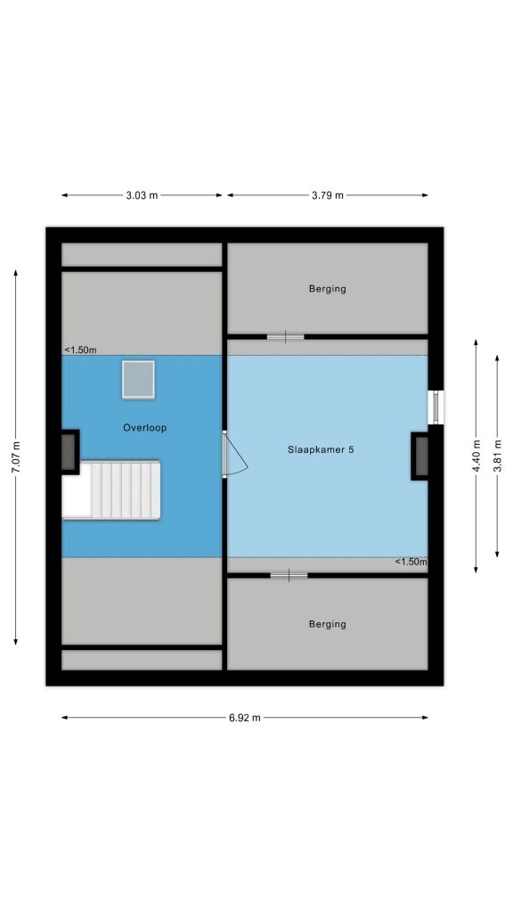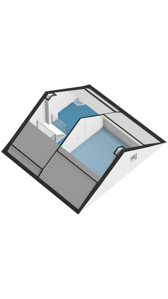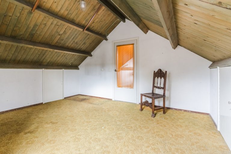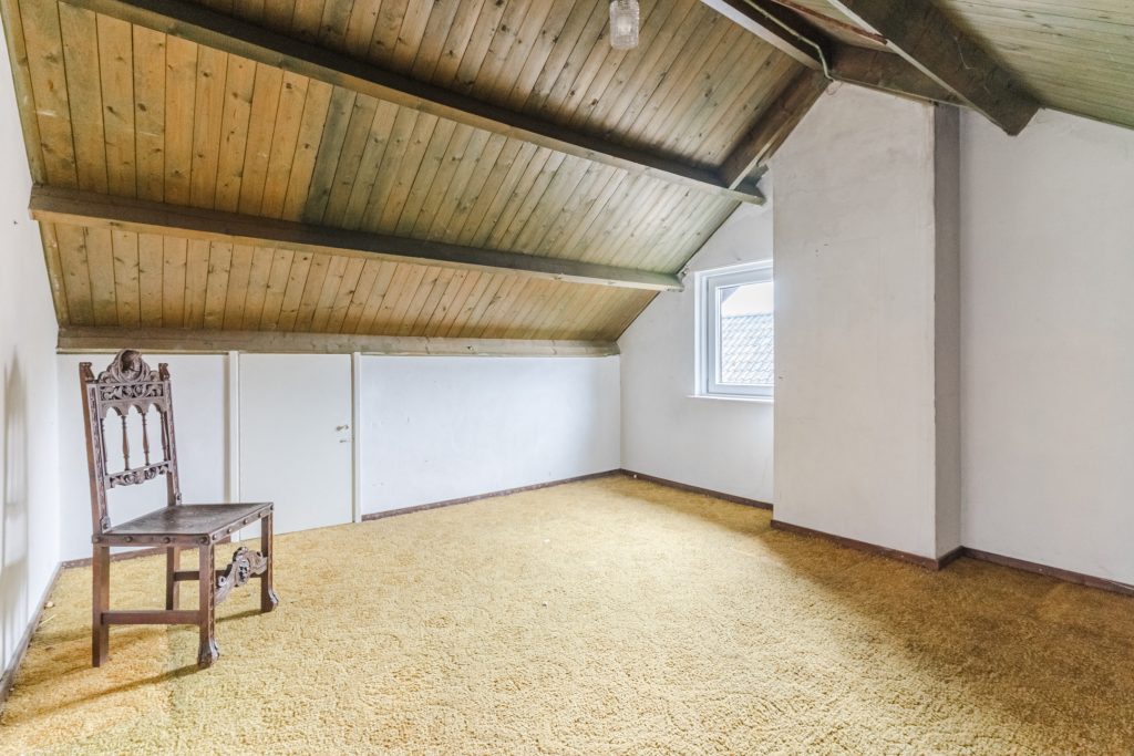 Ruime 5e slaapkamer met vloerbedekking en bergruimte aan beide zijden onder de dakschuinte.