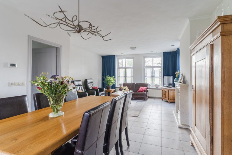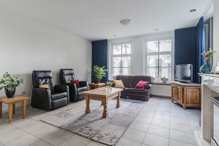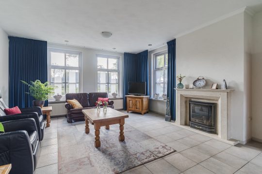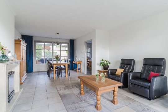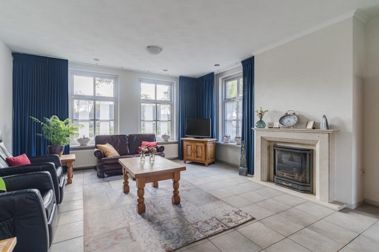 De zeer ruime woonkamer biedt een schitterend uitzicht over de vijver Lovensbroek. Er is voldoende ruimte voor een groot bankstel en meerdere fauteuils. Dankzij de raampartijen aan de voor-, zij- en achterkant geniet je dagelijks van veel natuurlijke lichtinval. Via de schuifpui heb je direct toegang tot de achtertuin met een overdekt terras. Ook deze ruimte is afgewerkt met een tegelvloer met vloerverwarming, stucwerk wanden, stucwerk plafonds en voorzien van een sfeervolle gashaard.