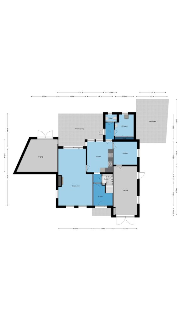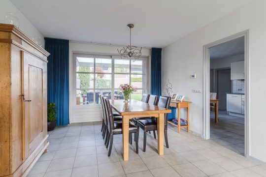 De keuken grenst tevens aan een kantoor of extra speelruimte — een multifunctionele kamer die je geheel naar eigen wens kunt inrichten. Vanuit deze ruimte kom je in de inpandige garage.