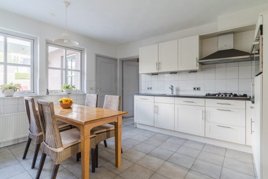De woonkeuken in hoekopstelling is uitgerust met diverse Siemens-inbouwapparatuur, waaronder een combi-oven, koelkast, vaatwasser, 5-pits gasstel en een afzuigkap. Daarnaast is er volop bergruimte aanwezig. Vanuit de keuken kun je via een vaste trap de kelder op sta hoogte bereiken.