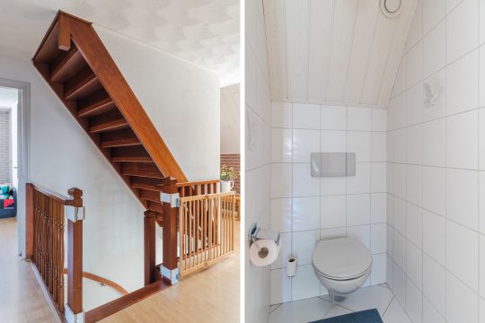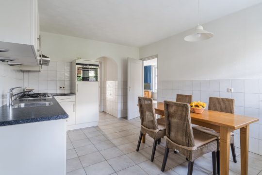 Vanuit keuken te bereiken portaal met toiletruimte en toegang tot praktische bijkeuken voorzien van de witgoedaansluitingen, uitstortgootsteen, CV-installatie (2023) met zonneboiler (2024) en een praktische inbouwkast.