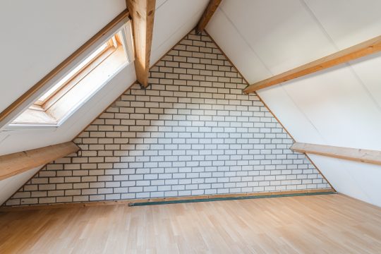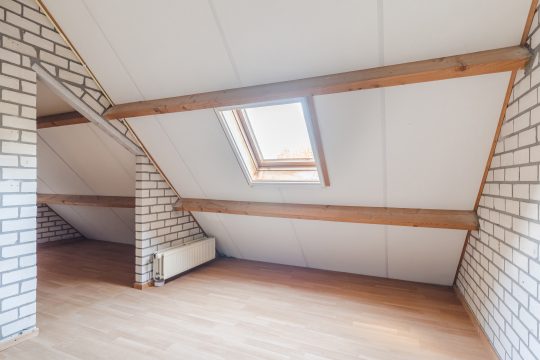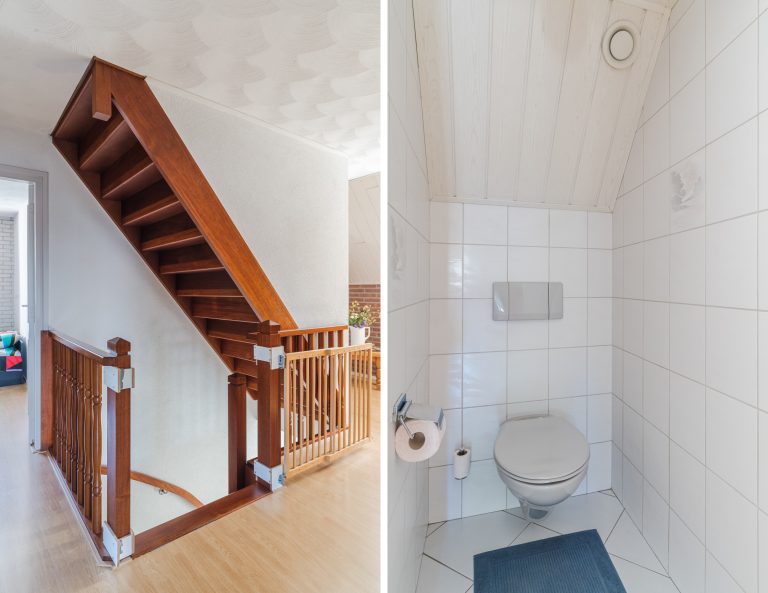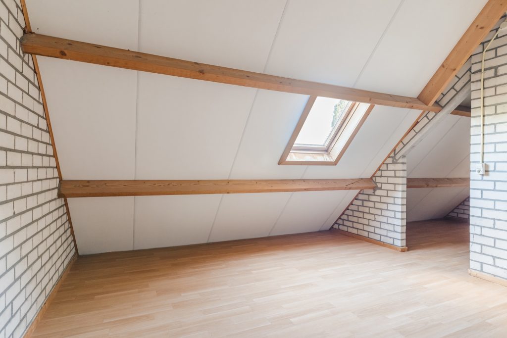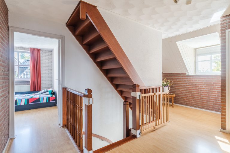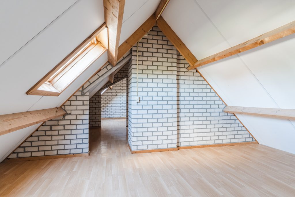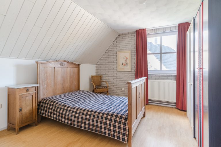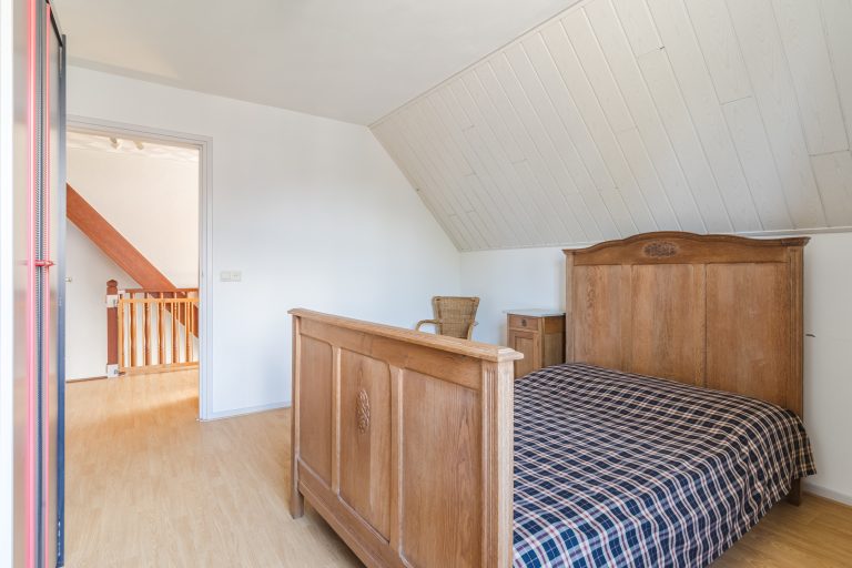 Via een vaste trap bereik je de tweede verdieping. Deze verdieping is voorzien van een betonnen verdiepingsvloer en afgewerkt met laminaat. Daarnaast is er voldoende ruimte voor het creëren van twee extra slaapkamers, beide uitgerust met een Velux-dakraam.