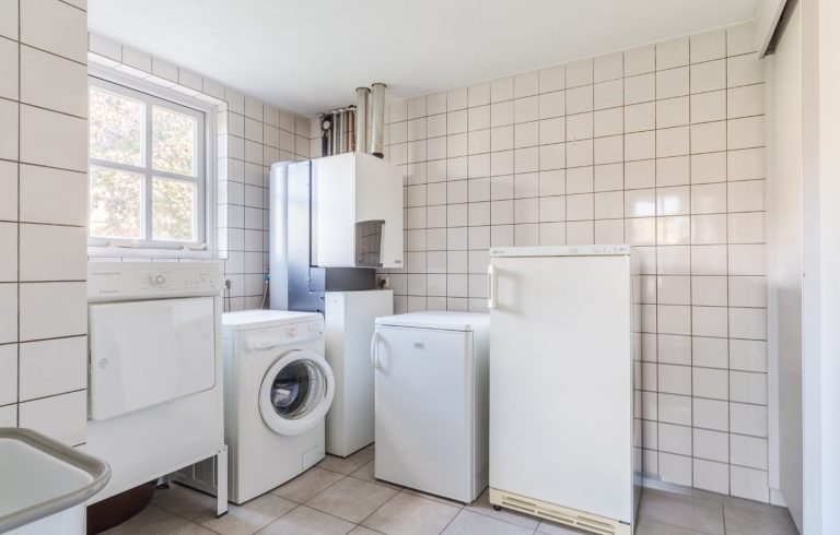 De garage is voorzien van de meterkast (8 groepen, 2 krachtgroepen en glasvezel), een grondwaterpomp en zowel dubbele deuren naar de oprit als een loopdeur naar de tuin. Ook de garage is weer keurig afgewerkt met een tegelvloer.
