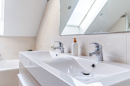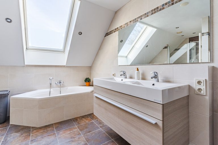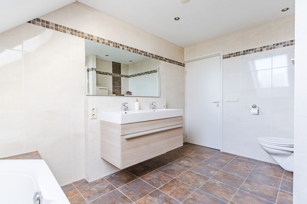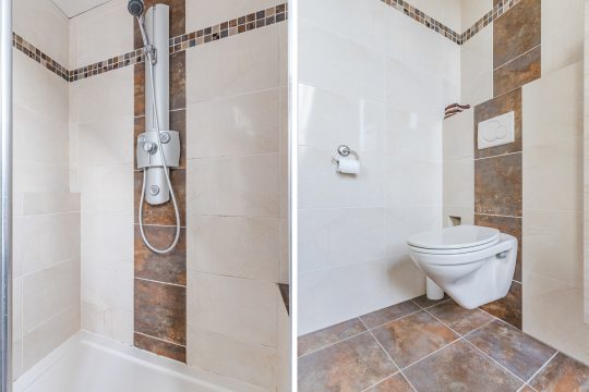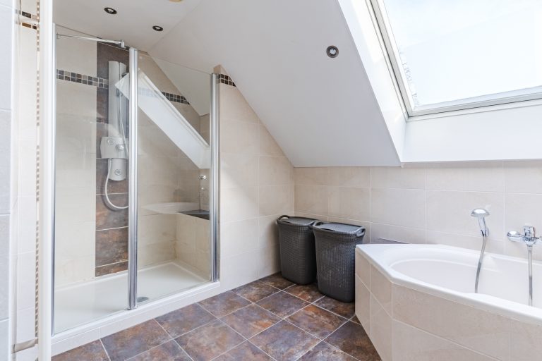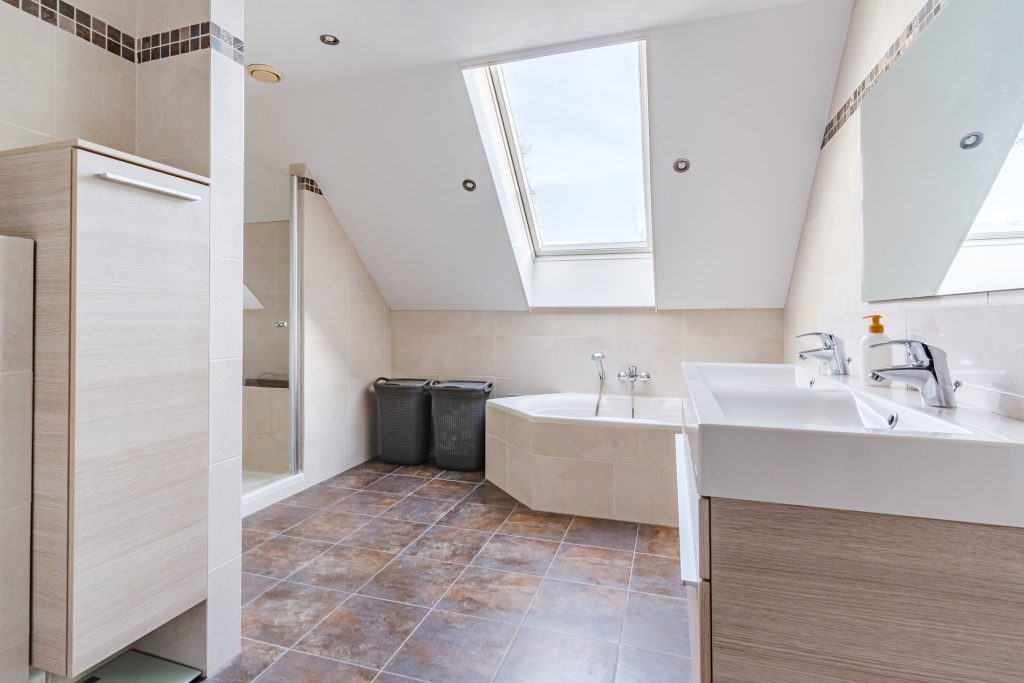 De badkamer is een ware blikvanger. Deze zeer ruime, volledig betegelde en fraai gemoderniseerde ruimte is uitgerust met een comfortabel ligbad, een aparte douchecabine, een wandcloset, een dubbel wastafelmeubel en vloerverwarming. De designradiator, het stucwerkplafond met inbouwspots en het Velux dakvenster maken het geheel compleet en geven de badkamer een luxe en serene sfeer.