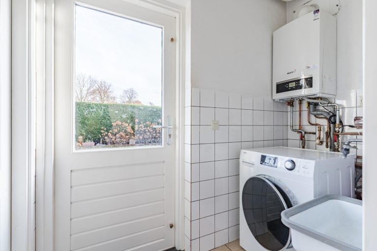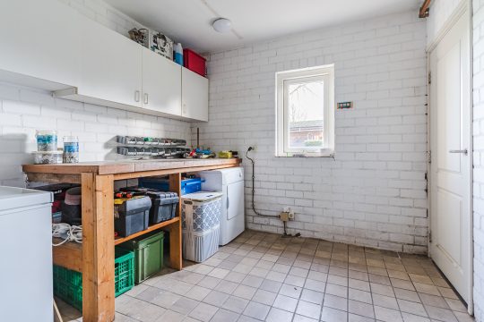 Vanuit de keuken is de praktische bijkeuken bereikbaar. Hier vind je onder andere de wasmachineaansluiting, een uitstortgootsteen en de c.v.-installatie. De bijkeuken biedt daarnaast toegang tot de achtertuin en leidt door naar een keurige, inpandige berging met tegelvloer.