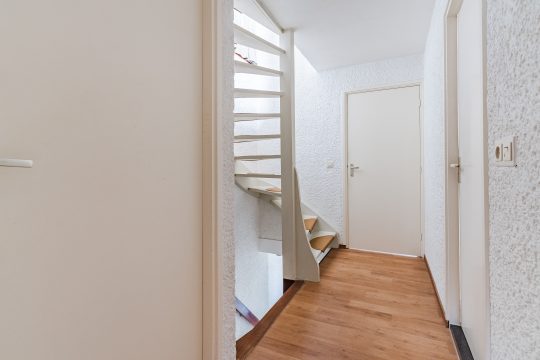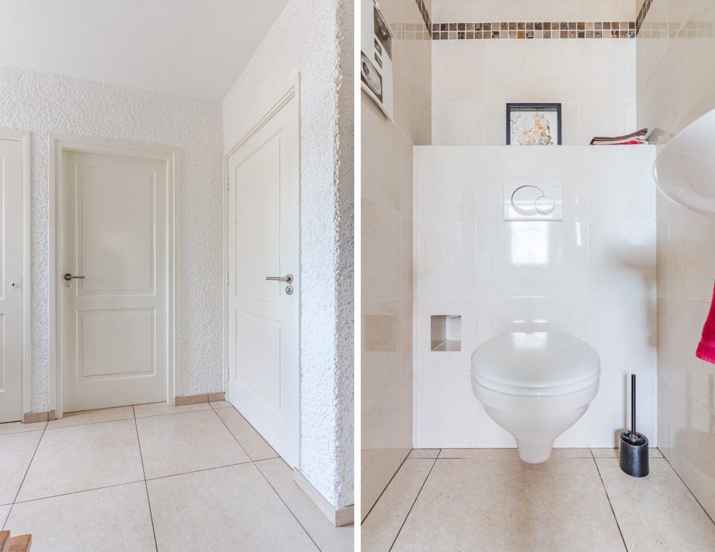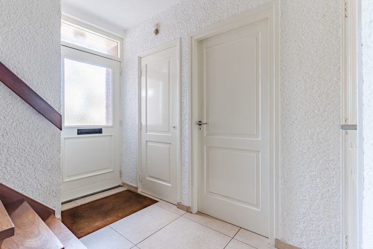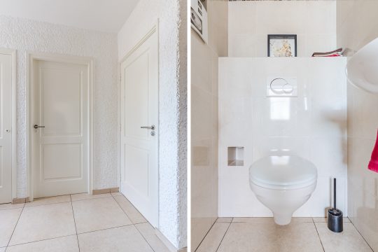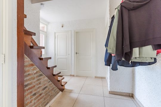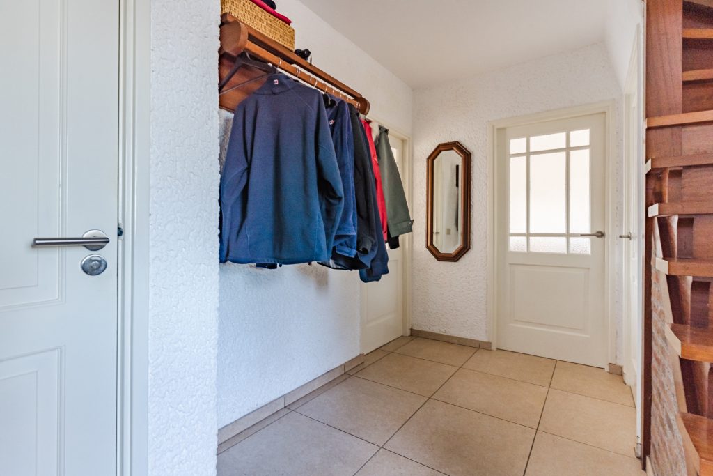 De ruime entree verwelkomt je met een verzorgde tegelvloer en een prettige hoeveelheid licht. Hier vind je de meterkast, een volledig betegelde toiletruimte met wandcloset en fonteintje, een praktische kelderkast en de hardhouten trapopgang naar boven.