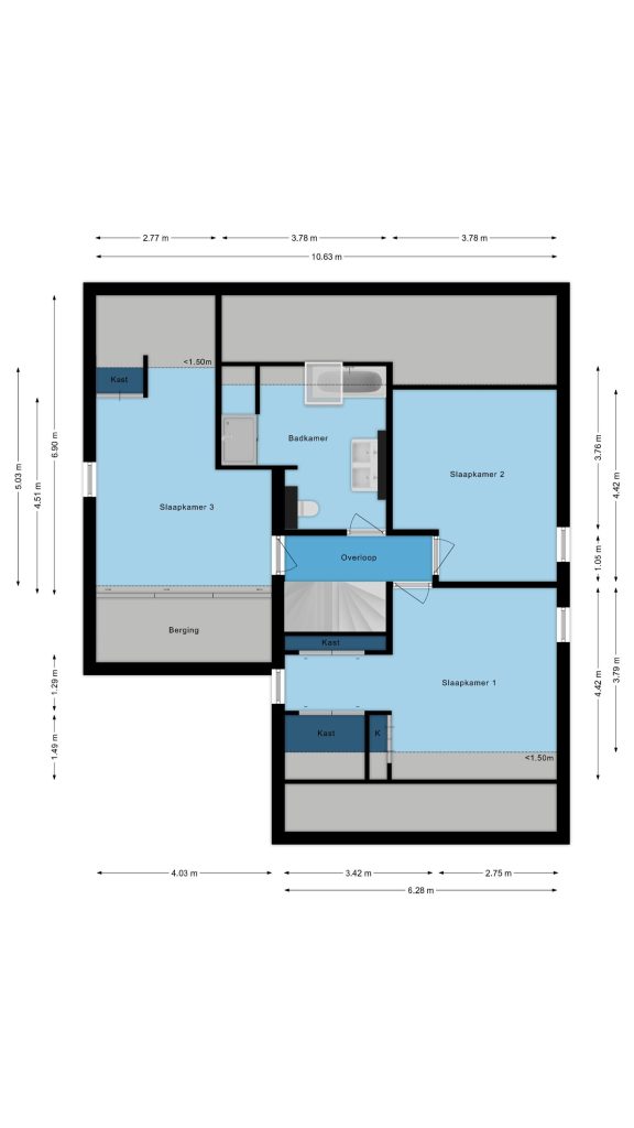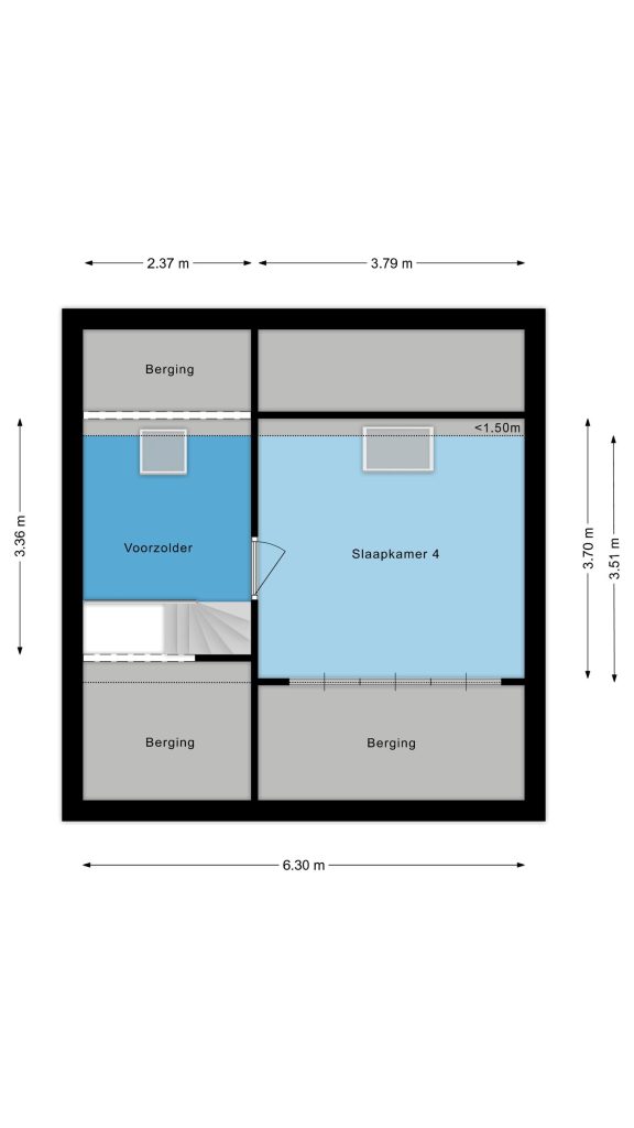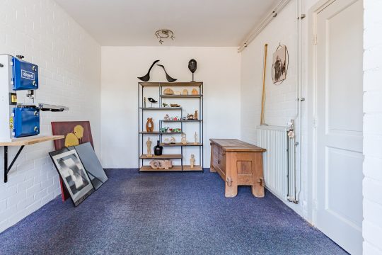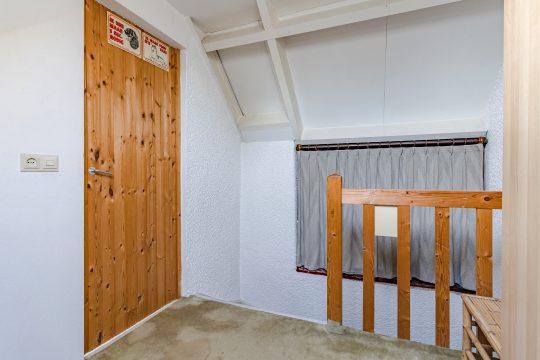 Via een vaste trap kom je op de voorzolder met vloerbedekking, veel bergruimte onder de dakschuinte en een prettig Velux venster dat de ruimte licht en luchtig maakt.
