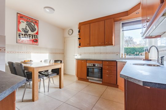 Aansluitend bevindt zich de half-open leefkeuken, die royaal is opgezet en voorzien is van een nette en complete keukeninrichting. Met een inductiekookplaat, afzuigkap, koelkast, vaatwasser, oven en een ruim aanrechtblad wordt koken hier een feestje.