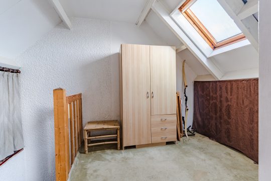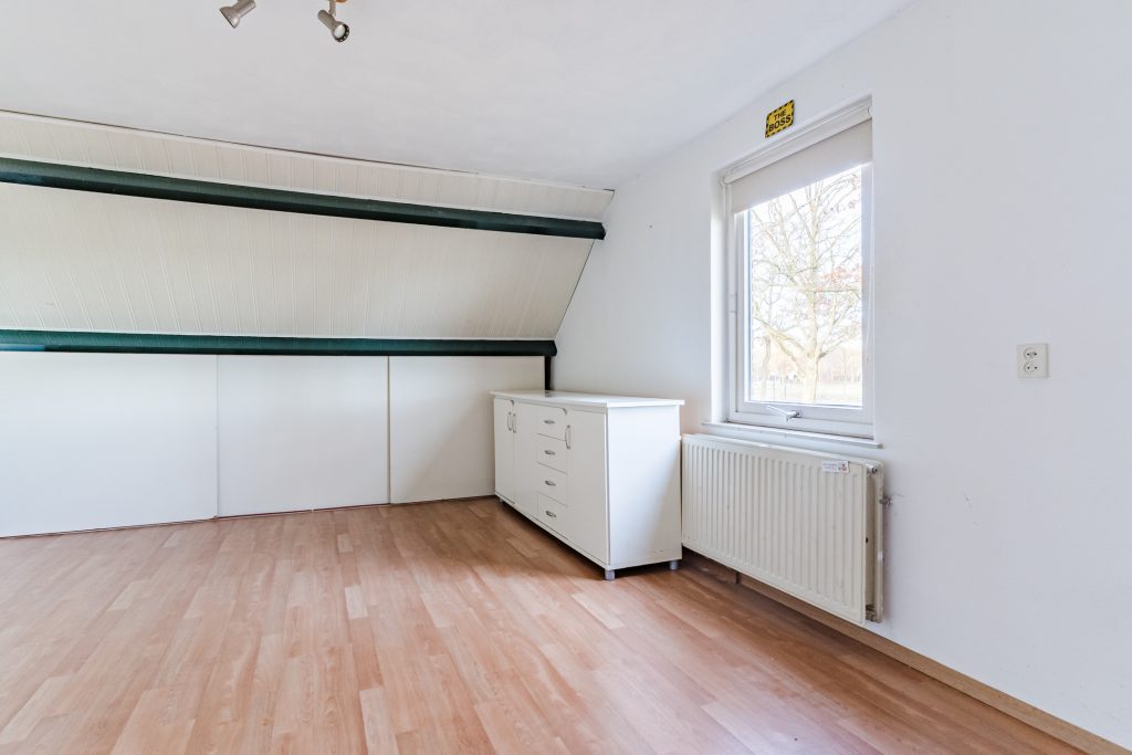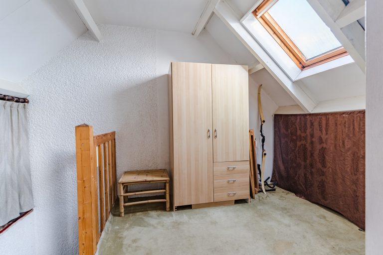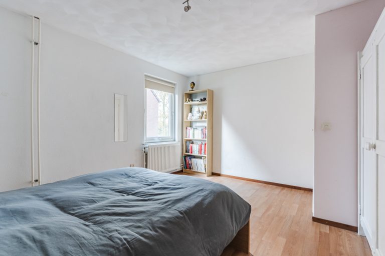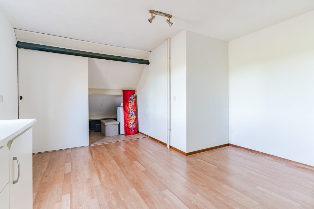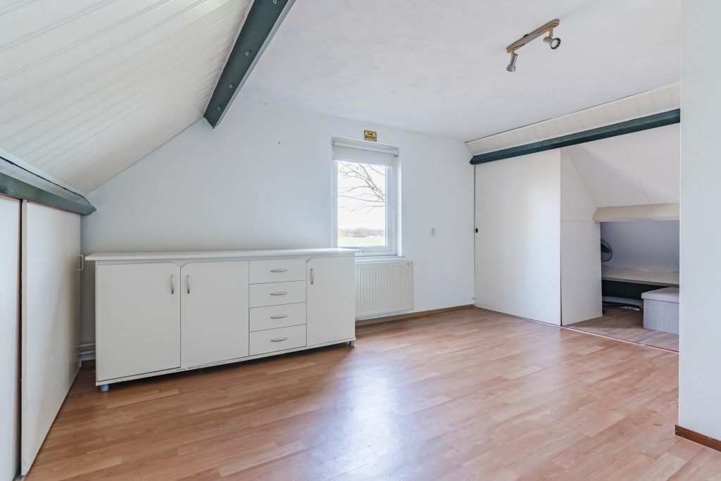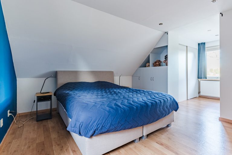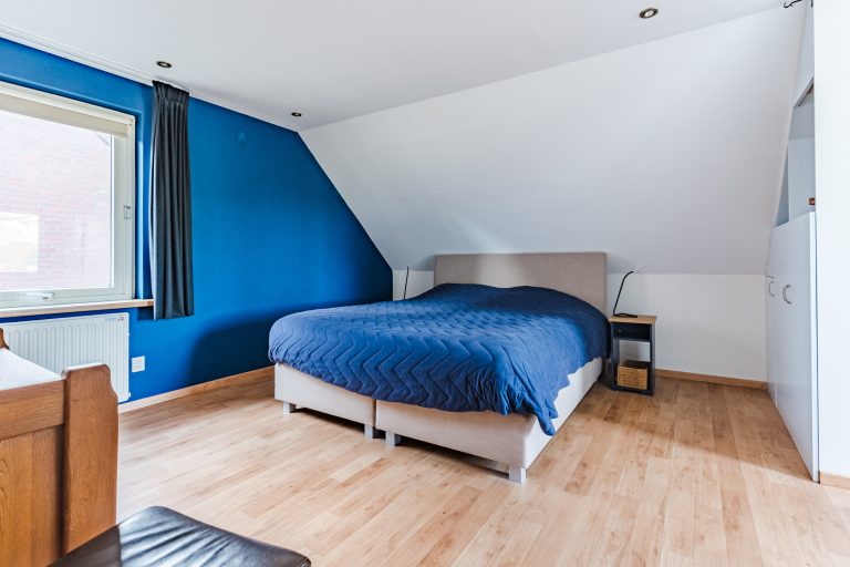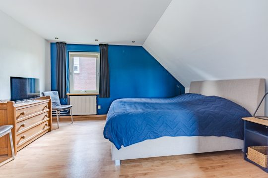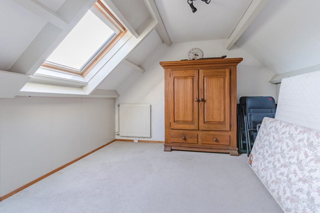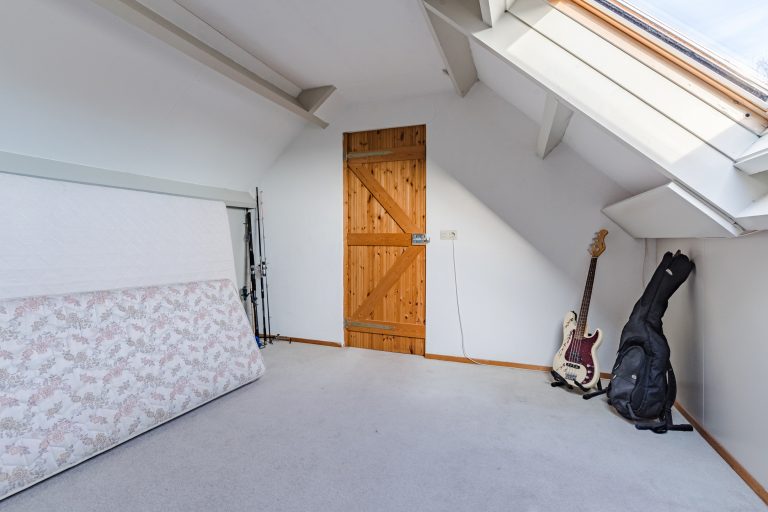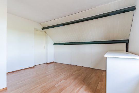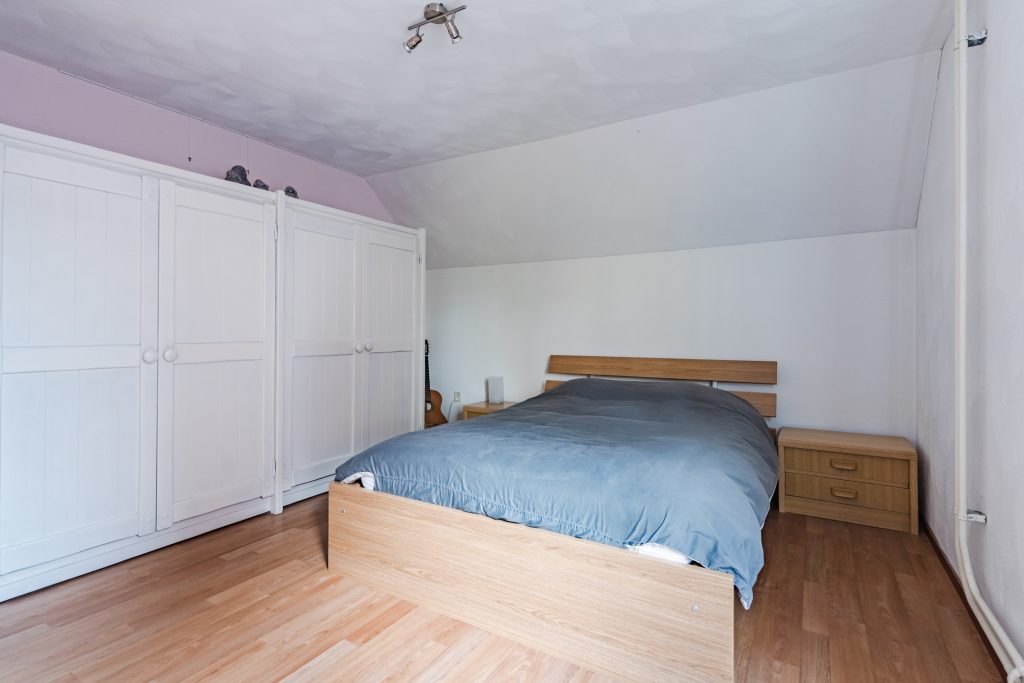 Aangrenzend bevindt zich de vierde slaapkamer, eveneens royaal in formaat en voorzien van vloerbedekking, een Velux dakvenster en bergruimte onder beide dakschuintes. Een ideale verdieping voor logees, een tienerkamer of een rustige thuiswerkplek.