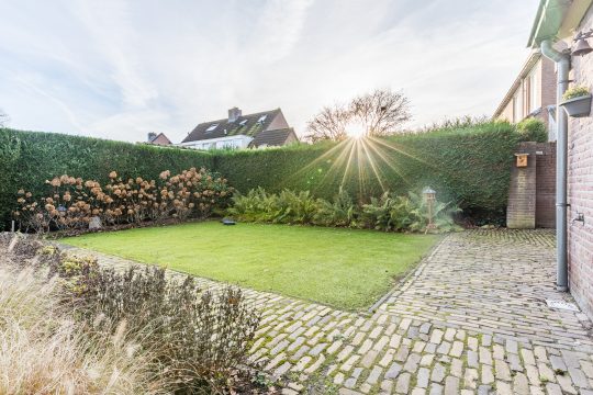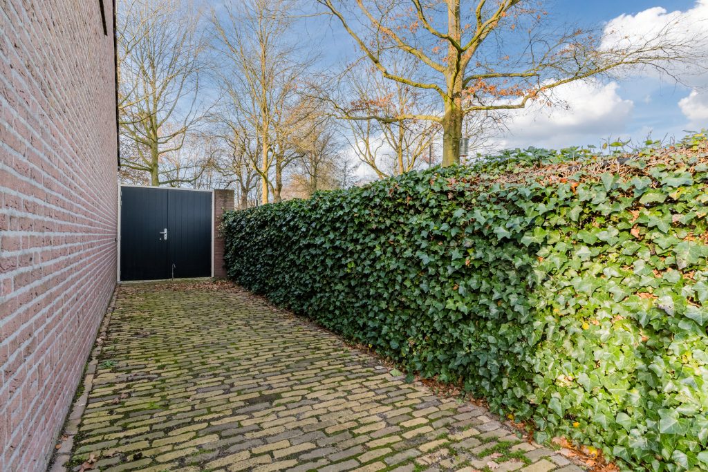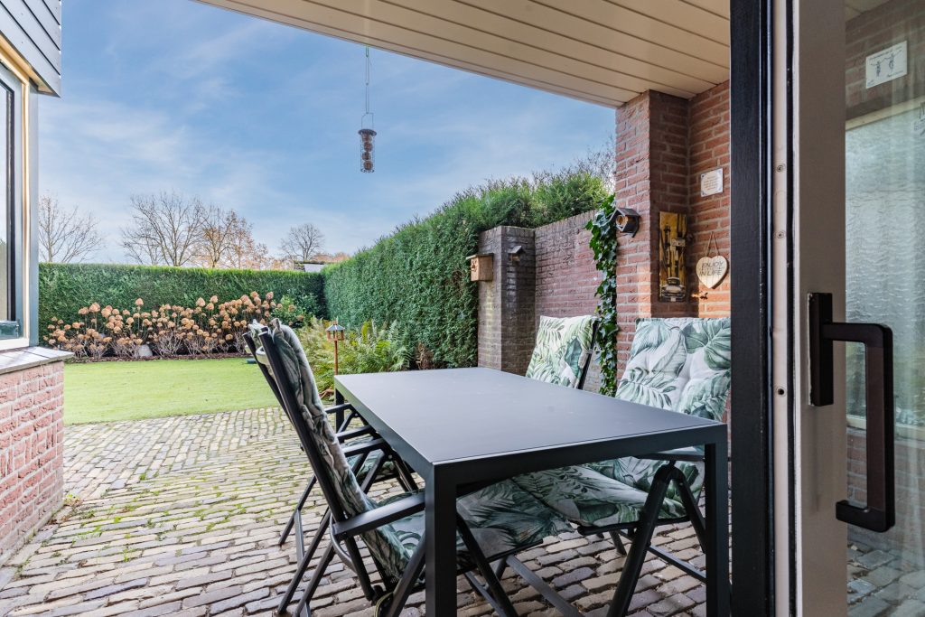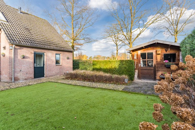 De achtertuin is een fijne, onderhoudsvriendelijke plek om te genieten van privacy en buitenleven. De combinatie van gebakken klinkers, kunstgras en de hoge coniferenhaag zorgt voor een groene en aangename sfeer. Aan de linkerzijde biedt een lagere beukenhaag vrij zicht op de landerijen, wat elke dag opnieuw een gevoel van rust en vrijheid geeft. De tuin beschikt verder over een houten tuinberging en een achterom met poort.