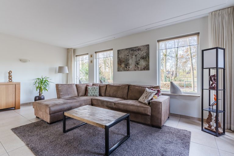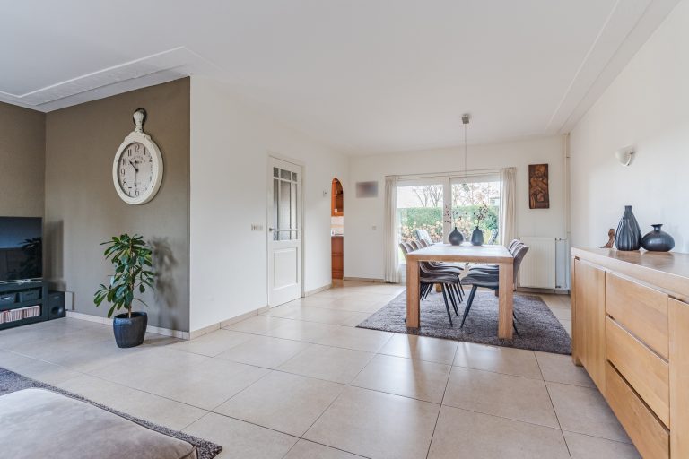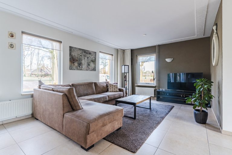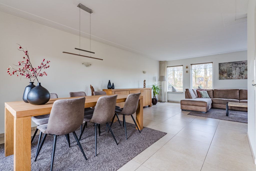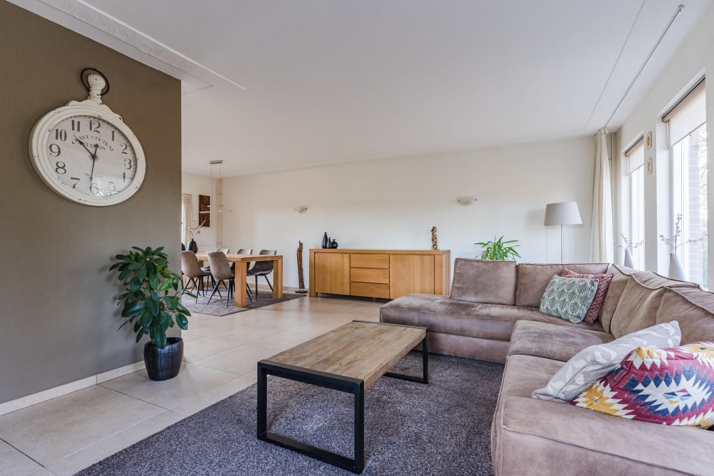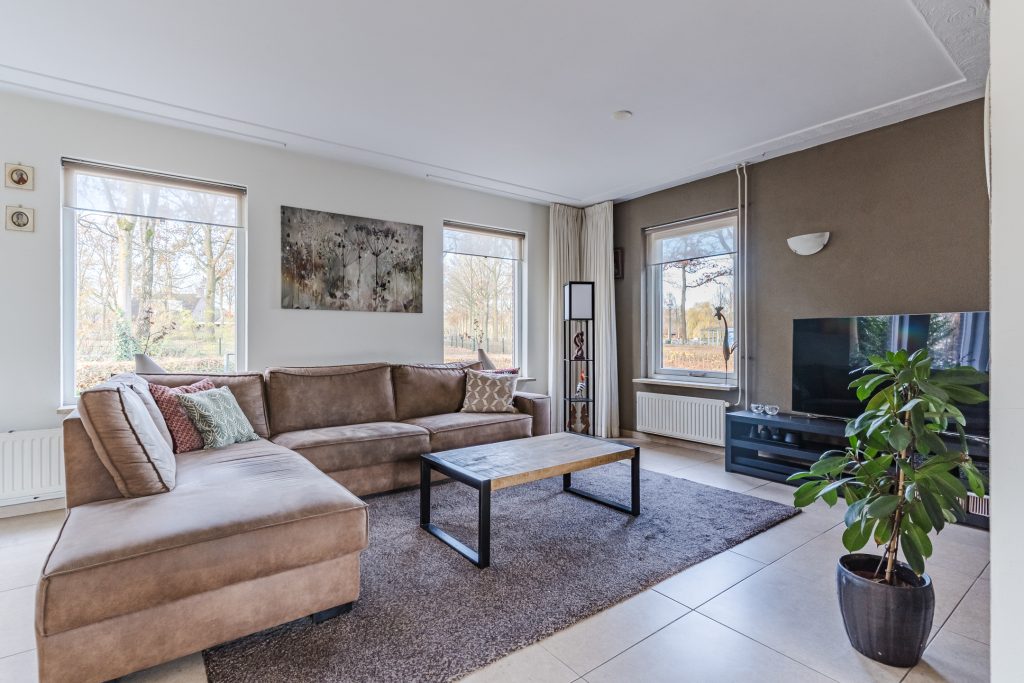 Vanuit de hal stap je de grote L-vormige woonkamer binnen, waar de royale raampartijen zorgen voor een prachtige lichtinval en een levendig uitzicht op zowel het park aan de voorzijde als de landerijen aan de linkerzijde. De woonkamer heeft een warme uitstraling dankzij de tegelvloer, de strakke stucwerkwanden en het stucwerkplafond met sierlijst. De schuifpui aan de achterzijde verbindt het woongedeelte moeiteloos met de tuin.