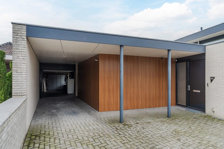 Garage met tegelvloer, praktisch vliering en stalen kanteldeur met toegang tot de oprit en carport.