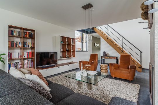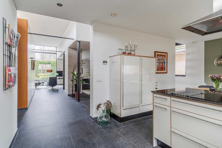 Keurige entreehal met een tegelvloer, volledig betegelde toiletruimte met wandcloset en fonteintje, garderobenis met verdeler van de vloerverwarming de uitgebreide meterkast (11 groepen, 1 kookgroep en 3 aardlekschakelaars) De eye-catcher in deze vormt ongetwijfeld de prachtige zwartstalen dubbele taatsdeur met toegang tot de woonkamer.