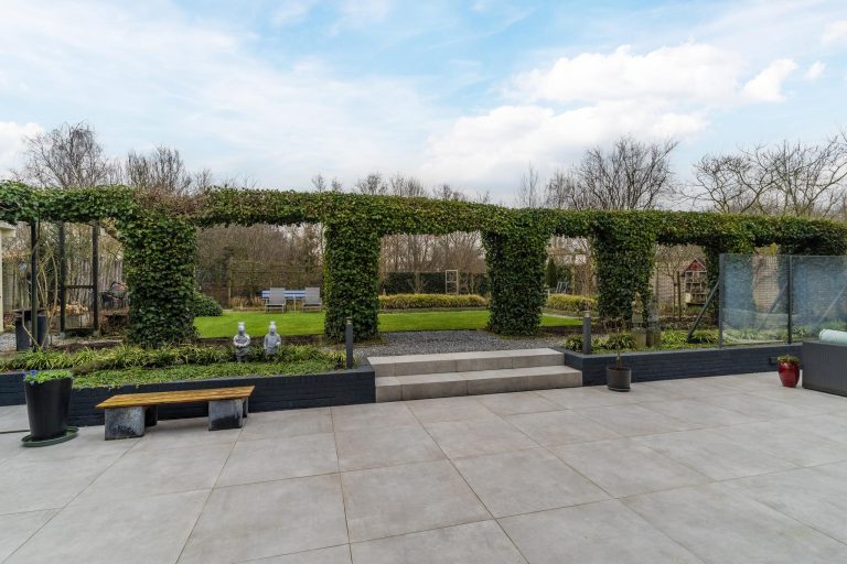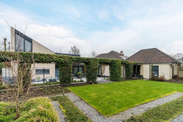 Zeer fraai aangelegde voortuin met een 3-tal Cortenstalen plantenbakken, diverse beplanting en toegang tot een royale oprit met parkeergelegenheid voor meerdere auto’s.