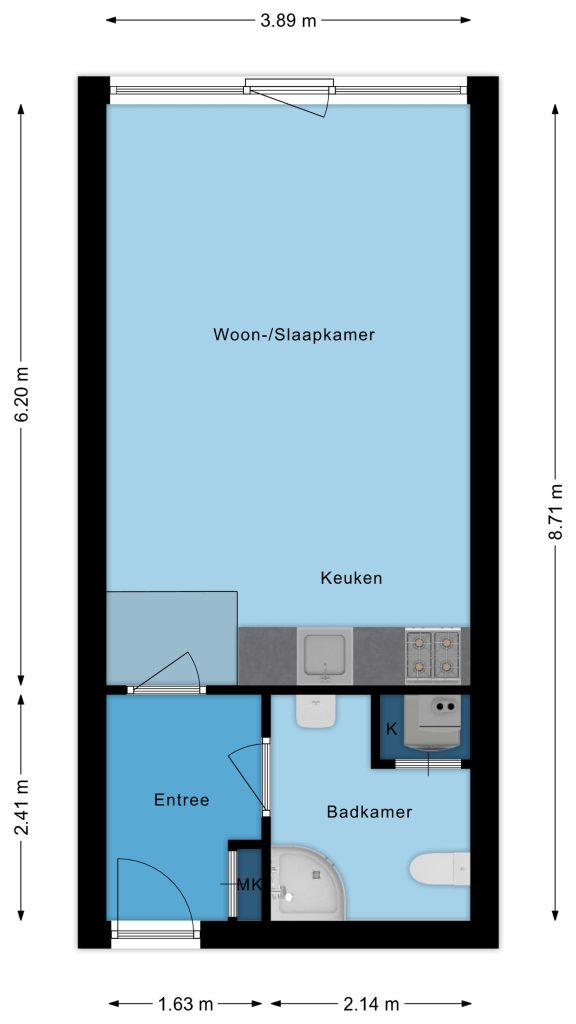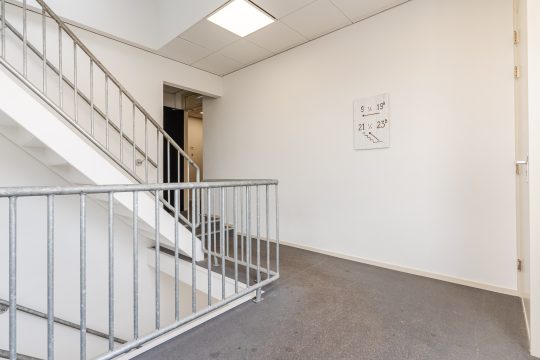 Via de centrale entree bereik je de eerste verdieping. De studio ligt aan de galerij en heeft een praktische indeling met een ruime woon en slaapkamer in één. Tevens is er op de begane grond een gezamenlijke fietsenberging aanwezig voor het stallen van de fiets.