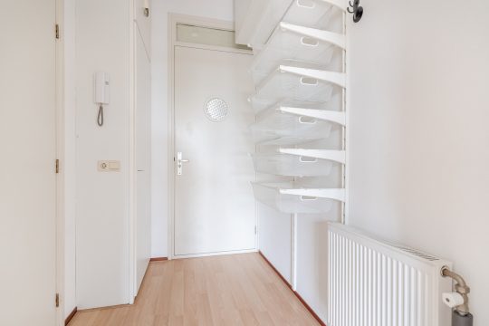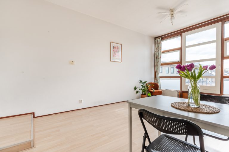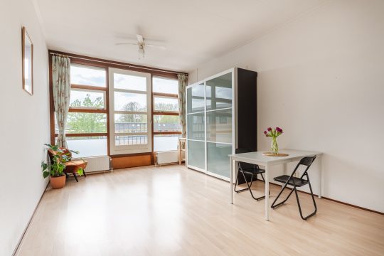 De woonruimte is voorzien van een laminaatvloer en strak afgewerkte wanden en plafonds met spuitwerk. Dankzij het Franse balkon valt er prettig daglicht binnen en kun je de deuren openzetten voor frisse lucht.