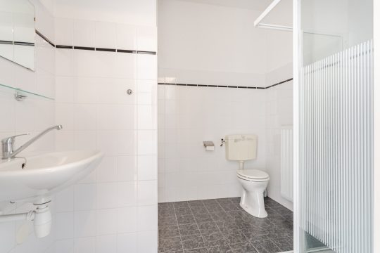 De badkamer is modern uitgevoerd en beschikt over een douchecabine, wastafel en hangcloset.